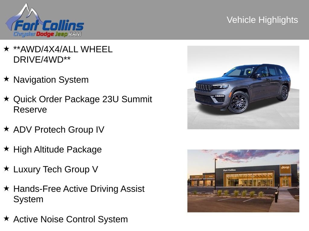 **AWD/4X4/ALL WHEEL DRIVE/4WD**, 19 Speakers High Performance Audio, 2nd-Row Manual Window Shades, 950 Watt Amplifier, Active Noise Control System, ADV Protech Group IV, Auxiliary Battery, Deluxe Headliner, Front Passenger Interactive Display, Gloss Black Exterior Accents, Hands-Free Active Driving Assist System, Heads-Up Display, High Altitude Package, Luxury Tech Group V, Navigation System, Neutral Gray Exterior Accents, Night Vision w/Pedestrian-Animal Detection, Painted Door Cladding, Palermo Leather Door Trim, Palermo Leather Seats, Quick Order Package 23U Summit Reserve, Rearview Autodim Digital Display Mirror, Summit Reserve, Summit Reserve Badge, Ventilated Rear Seats, Wheels: 21" x 9" Black Painted Aluminum, Wheels: 21" x 9" Machined Face/Painted Aluminum, Wireless Charging Pad.