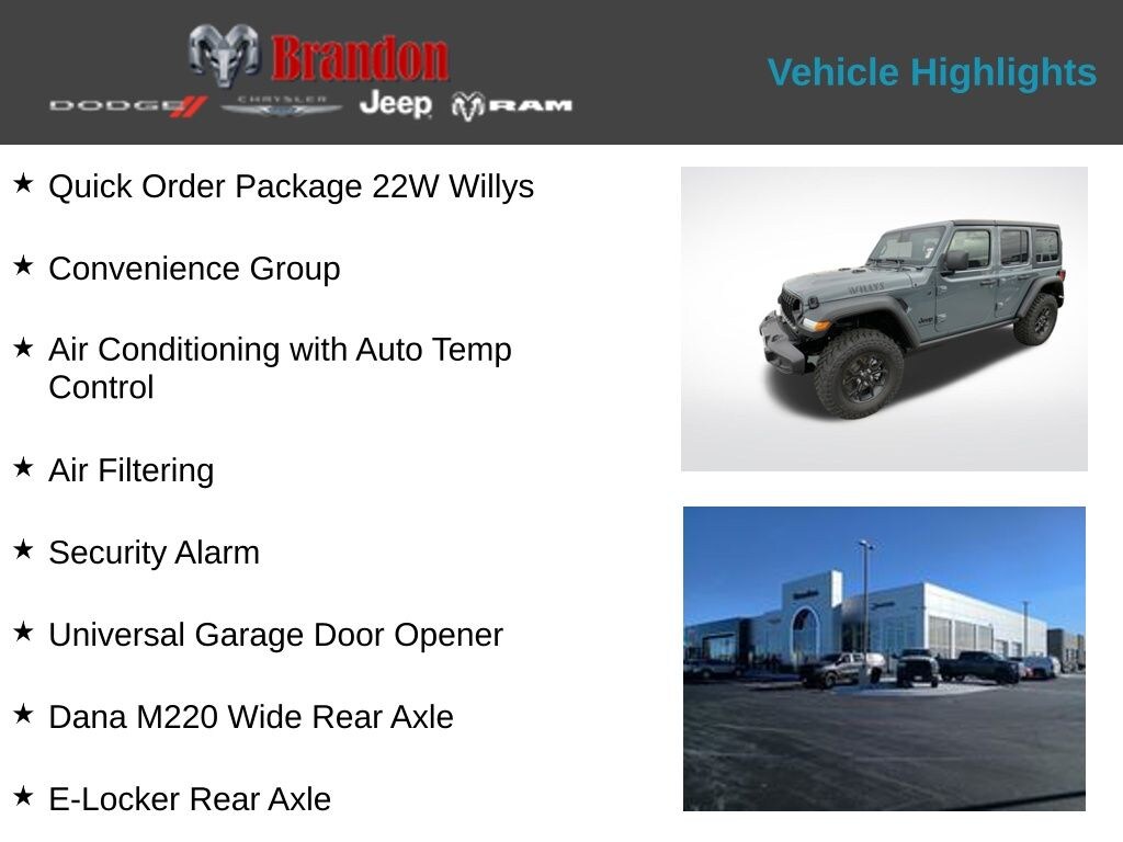 Don't settle for anything less than the best. The 2026 Jeep Wrangler Willys is here, and it's ready to redefine your idea of adventure. Come in and experience the difference for yourself. We look forward to helping you find your perfect match. Price includes: $1000 - 2026 National Retail Bonus Cash . Exp. 04/30/2026 $1000 - 2026 National Stellantis Loyalty Bonus Cash . Exp. 04/30/2026