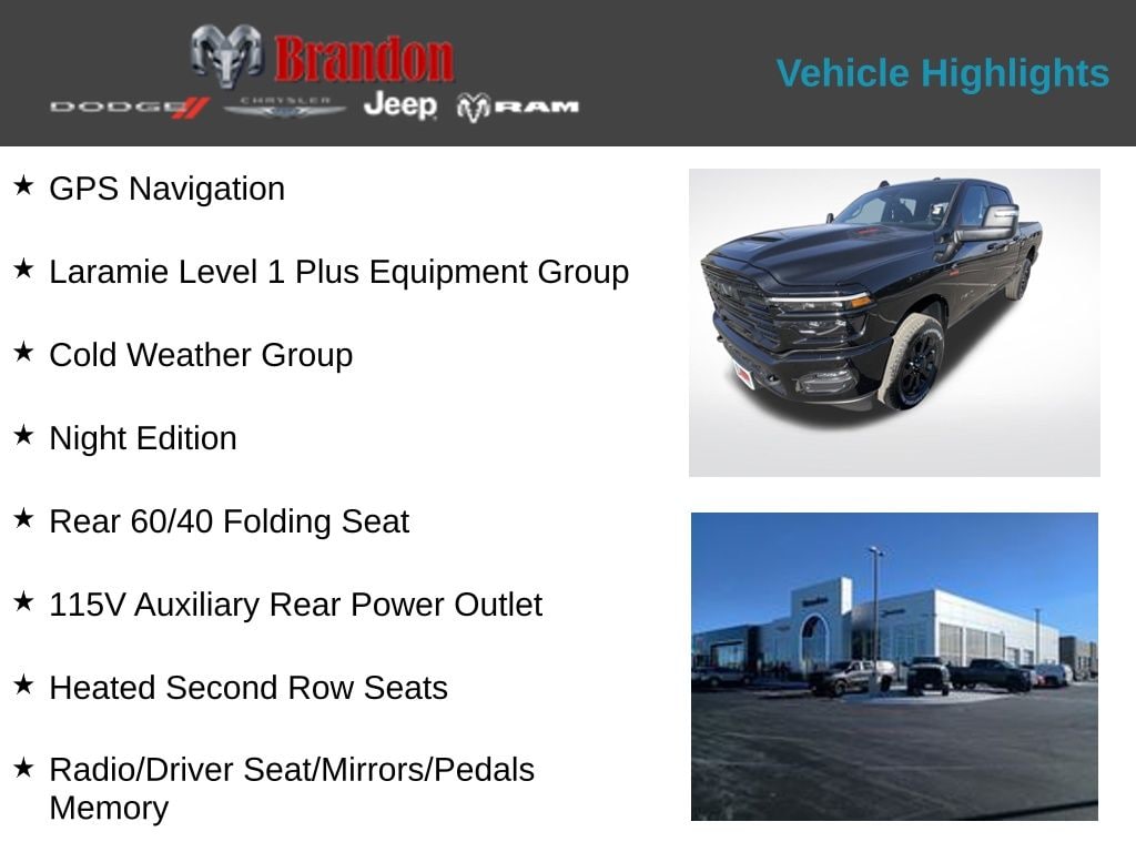 Whether you're tackling tough jobs or embarking on epic adventures, the 2026 Ram 2500 Laramie is the ultimate companion. Its impressive capabilities, advanced technology, and premium amenities make it the perfect choice for those who demand the best. Experience the difference for yourself and schedule a test drive today. This remarkable truck is ready to elevate your driving experience to new heights. Price includes: $1000 - 2026 National Bonus Cash . Exp. 03/02/2026